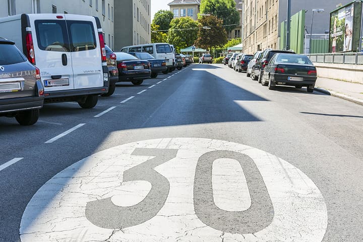 Sie befinden sich im Ortsgebiet. Dürfen Sie rechts vor den Verkehrszeichen parken? Warum?