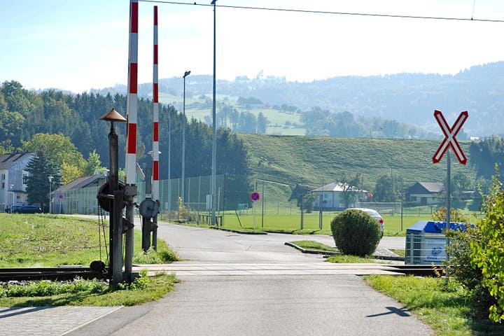 Sie wollen diese Eisenbahnkreuzung überqueren. Beschreiben Sie die Situation!
