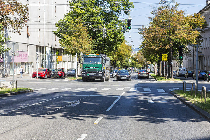 Sie wollen an dieser Kreuzung nach links einbiegen. Auf welche Verkehrsteilnehmer haben Sie besonders zu achten?