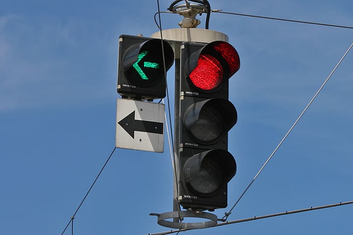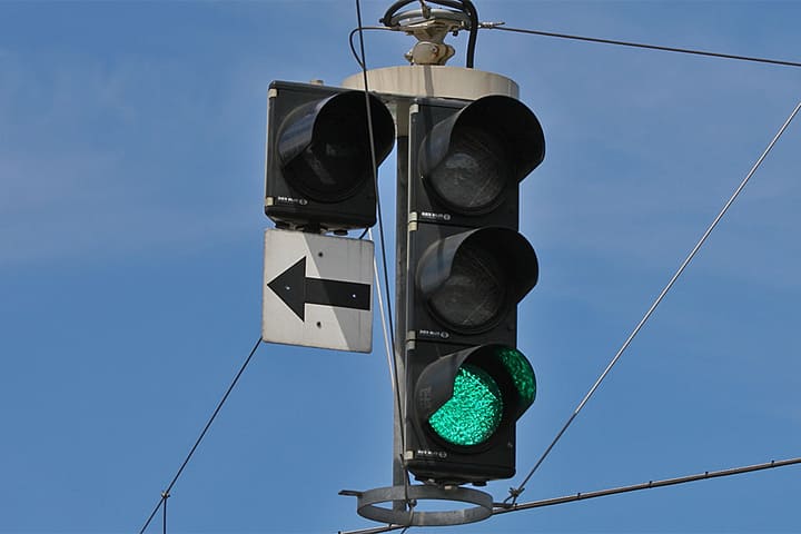 In welche Richtung dürfen Sie fahren, nachdem die Ampel über Ihrem Fahrstreifen auf "Grün" umgeschaltet hat?