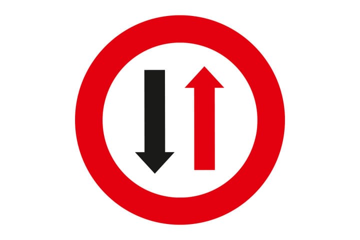 Sie sind bei diesem Verkehrszeichen bereits in die Engstelle eingefahren. Entgegenkommende Fahrzeuge nähern sich der Engstelle. Wie verhalten Sie sich?