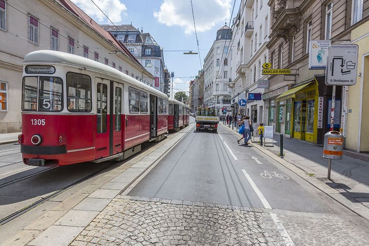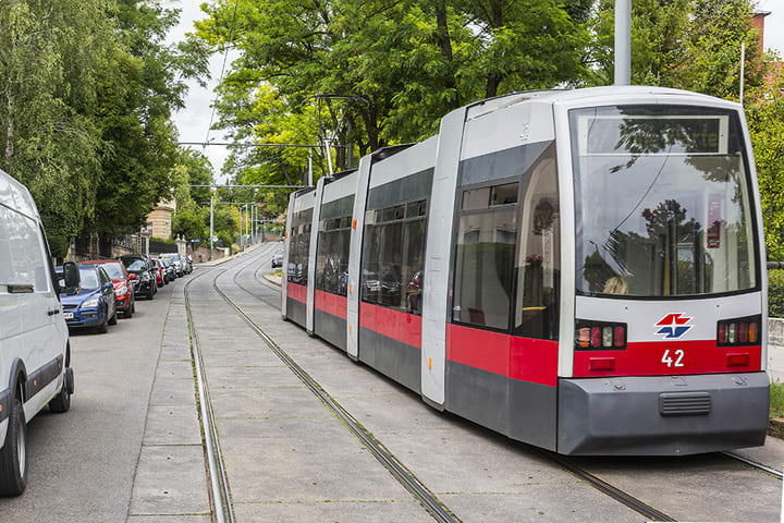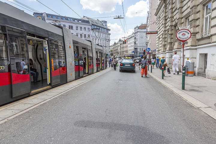 Die Straßenbahn hält hier in der Haltestelle. Warum dürfen Sie nicht vorbeifahren?