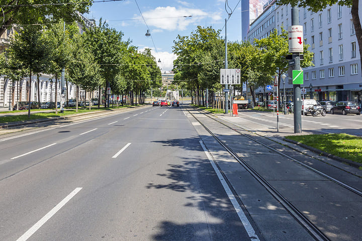 Die Straßenbahn hält hier in der Haltestelle. Auf welcher Seite dürfen Sie vorbeifahren?