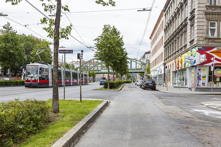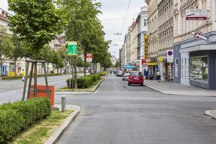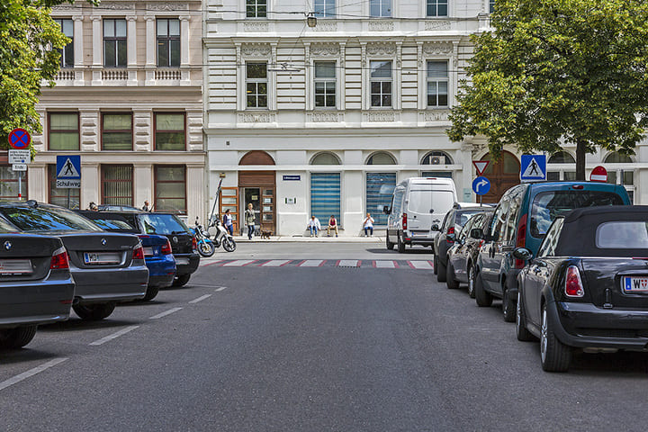 Sie möchten zu dem roten Haus auf der linken Straßenseite fahren. Warum müssen Sie zur zweiten Kreuzung fahren und erst dort nach links in die Nebenfahrbahn einbiegen?