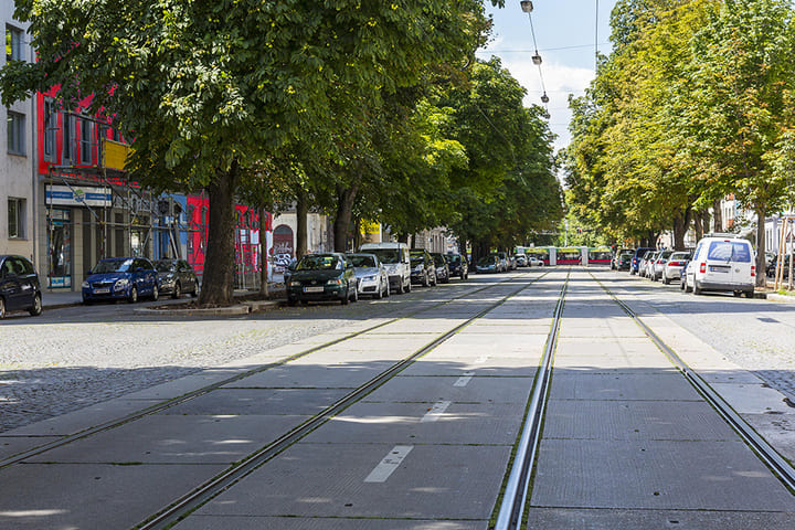 Sie wollen in dieser Straße geradeaus weiterfahren. Wie verhalten Sie sich?