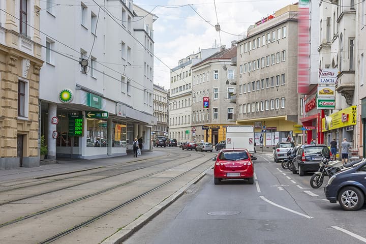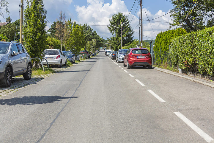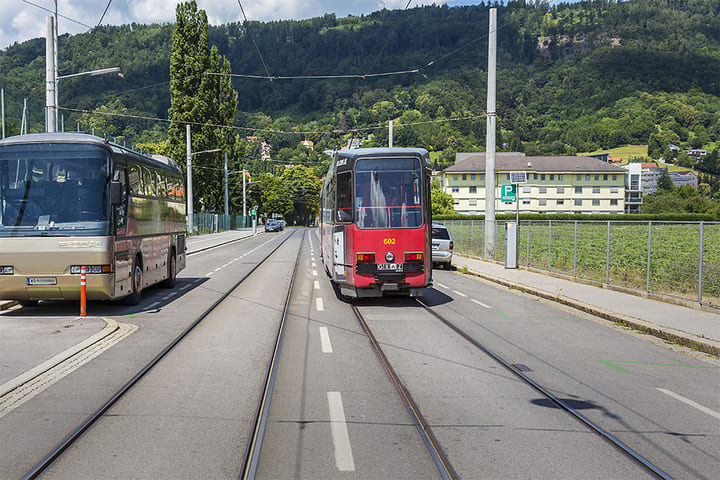 Die Straßenbahn fährt mit etwa 20 km/h. Am rechten Fahrbahnrand sind Fahrzeuge abgestellt. Dürfen Sie hier links überholen?