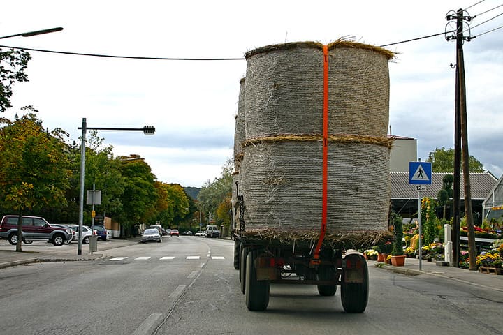 Der Traktor mit Anhänger fährt mit etwa 10 km/h. Wie verhalten Sie sich?