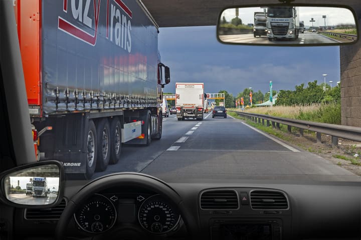 Der Kleinbus rechts fährt 100 km/h. Sie fahren mit 130 km/h. Welche Gefahren können hier auftreten, wenn Sie sich falsch verhalten?